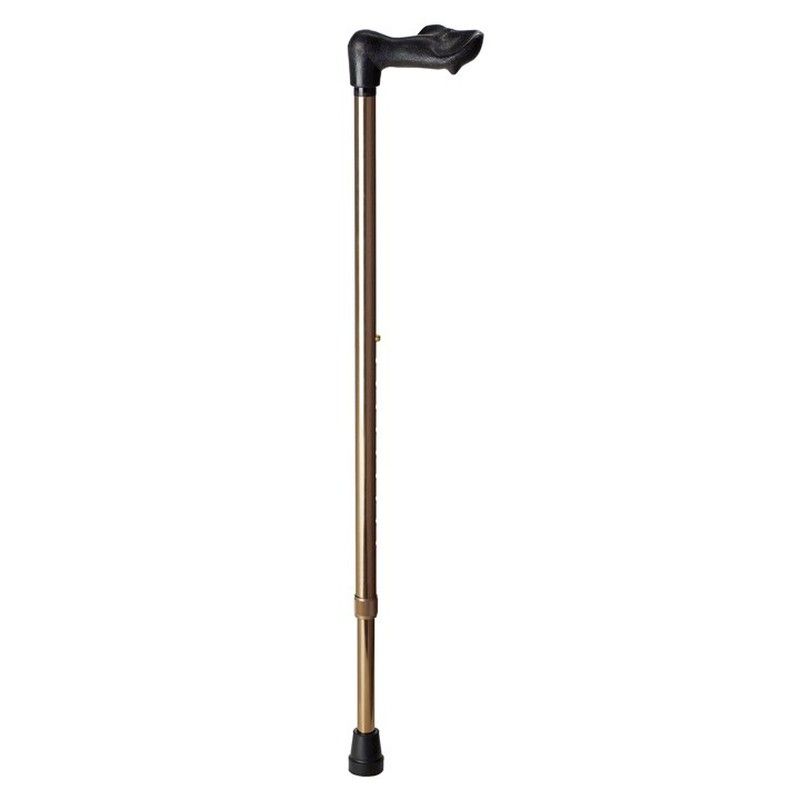 Aluminiumstock mit anatomischem Links-/Rechtsgriff. Der anatomische Griff ermöglicht eine natürliche und bequeme Handhaltung und lindert Druck, Verspannungen und daraus resultierende Schmerzen deutlich. Höhenverstellbar von 80 cm bis 102 cm mit Geräuschdämpfung, die die störenden Geräusche vieler Gehstöcke beim Gehen verhindert. Für Rechts- und Linkshänder erhältlich; siehe AD415d oder AD415i. Rohrdurchmesser: 19 mm.