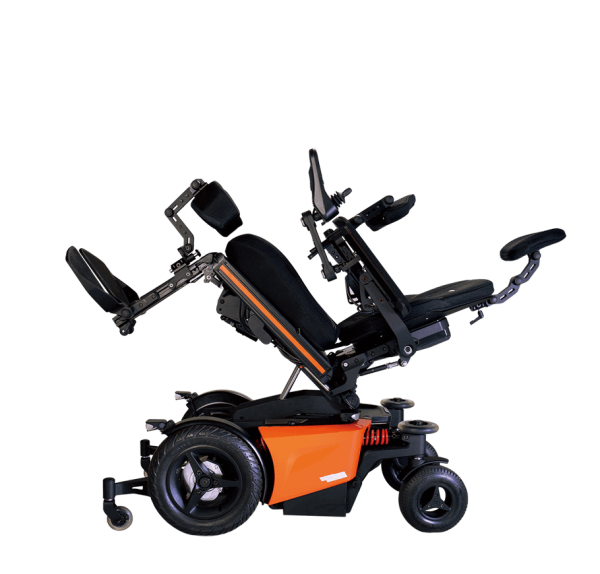 Biomechanische Prinzipien wurden in die Konstruktion dieses Rollstuhls für seine elektrischen Funktionen zum Neigen, Zurücklehnen, Aufrichten und Stehen integriert. Der Sitz bewegt sich mit dem Körper des Benutzers. Trotz seiner maximalen Höhe ist dieser Rollstuhl sehr kompakt. Er bietet drei Geschwindigkeitsstufen: 6/9/12 km/h. Einfache Konfiguration. R-Net-Steuerung: Ermöglicht die Steuerung von Geräten per Bluetooth oder Infrarot über den Joystick. ABMESSUNGEN Dieser Rollstuhl ist vollständig konfigurierbar. Die Sitzfläche ist in der Breite von 42 cm bis 52 cm, in der Tiefe von 40 cm bis 60 cm und in der Höhe von 41,5 cm bis 46,5 cm verstellbar. Die Rückenlehne ist von 51 cm bis 67 cm und die Armlehnen von 18 cm bis 30 cm verstellbar. Die Fußstützen sind von 40 cm bis 60 cm verstellbar. Elektrische Funktionen: Elektrische Neigung: 0–50° Elektrische Rückenlehnenverstellung: (-5)–90° Elektrische Fußstütze (zweistufig): (-5)–90° Elektrische Höhenverstellung: 0–40 cm Die Federung an allen vier Rädern absorbiert Vibrationen, selbst auf unebenem Gelände. Der 320-W-Motor wird von zwei 50/80-Ah-Akkus angetrieben und ermöglicht eine Reichweite von 25/45 km. Dank seines Wendekreises von 75 cm eignet er sich sowohl für den Innen- als auch für den Außenbereich. Der maximale Neigungswinkel beträgt 10°, und er kann Bordsteinkanten bis zu 7 cm Höhe überwinden. Das maximale Benutzergewicht beträgt 136 kg. Das Gesamtgewicht dieses Rollstuhls beträgt 215 kg mit 80-Ah-Akkus und 165 kg ohne Akkus. FARBEN Dieser elektrische Stehrollstuhl ist in drei verschiedenen Farben erhältlich: Leuchtendes Orange Weiß Silber und Schwarz