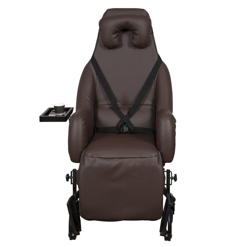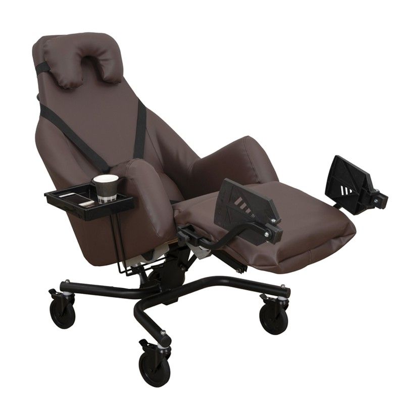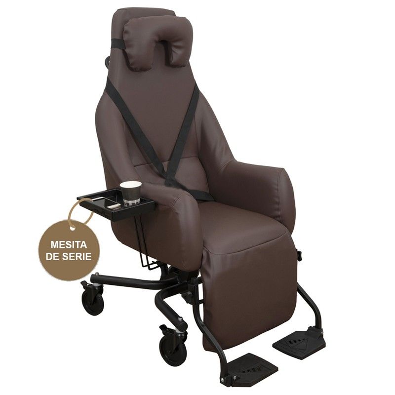 Der ESSENTIEL Kippstuhl ist ausschließlich für den Innenbereich bestimmt und für Personen mit Begleitperson konzipiert. ESSENTIEL wurde von unseren Forschungs- und Entwicklungsteams für maximalen Benutzerkomfort entwickelt. Der schalenförmige Stuhl besteht aus HD-Schaum (High Density). Er wird standardmäßig mit einem Beistelltisch, einem Sitz aus Visco-Memory-Schaum (Klasse II), einem Gurtsystem und einem anatomischen Nackenkissen geliefert. Er verfügt über eine Fußstütze mit unabhängigen, klappbaren Plattformen. In der halb zurückgelehnten Position ist die Fußstütze für mehr Komfort mit der Sitzfläche ausgerichtet. Beistelltisch serienmäßig