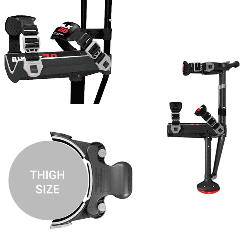 Höhenverstellung: Verwenden Sie einen Druckknopf, ähnlich wie bei herkömmlichen Krücken. Stellen Sie die Länge des Oberschenkels so hoch wie möglich ein, sodass die Oberschenkelstützen oben am Bein anliegen.