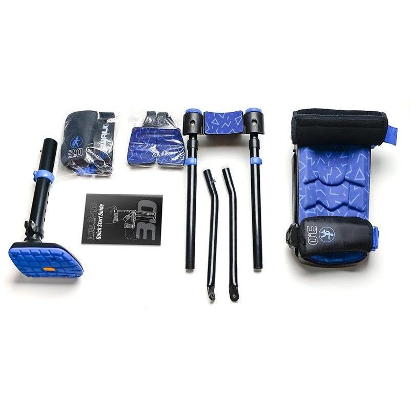 Weitere Komponenten: Griff, Schnellverschlüsse, Lockerungs- und Straffungsgurt, Längenverstellgurt, Kniegurt, Plattformpolster, Knieplattform, Mutter und Schraube und schließlich der Fuß.