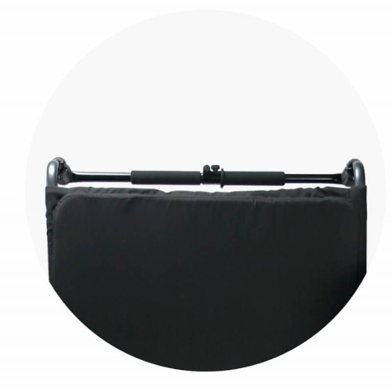 Er ist mit einem klappbaren Schiebebügel ausgestattet, der an den Griffen des Rollstuhls befestigt ist und das Schieben und Manövrieren mit einer Hand erleichtert.