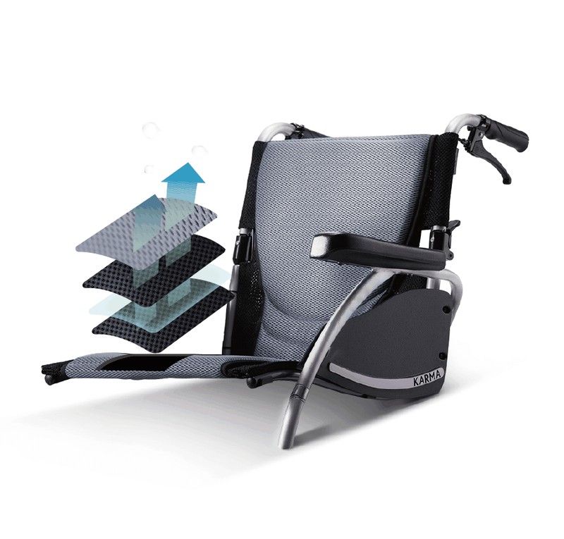 Das ergonomische Polster ist nach innen gewölbt, sodass der Benutzer Arme und Ellbogen darauf ablegen kann. Außerdem ist das Polster an den unteren Kanten schmaler, sodass Ihre Hände beim Selbstantrieb weniger behindert werden.