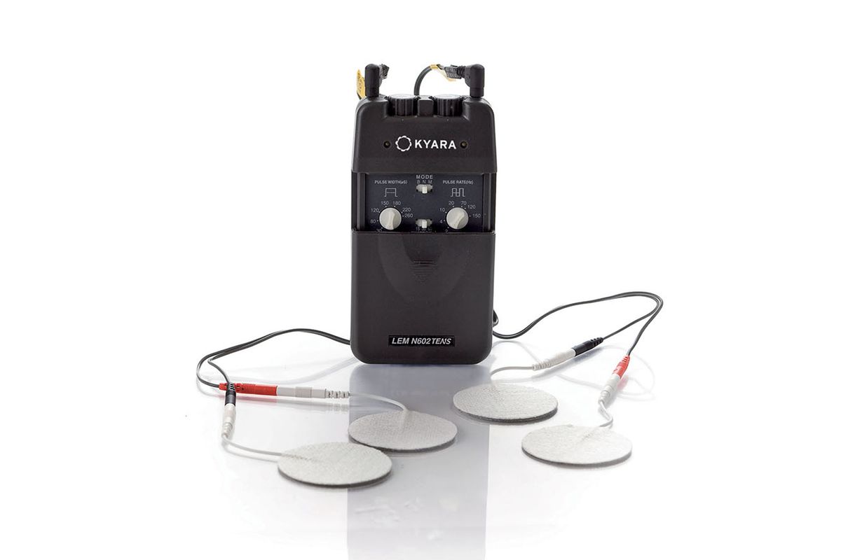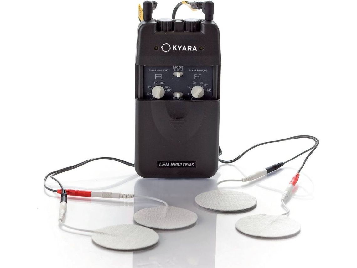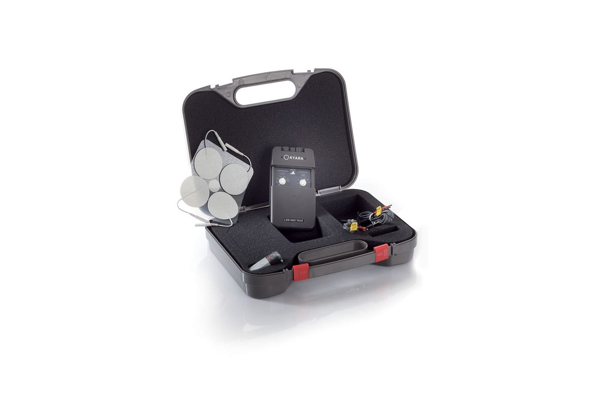 Einstellbare Parameter 3 Modi: Burst (B): Impulsfolge mit einstellbarer Amplitude und Frequenz; Normal (N): Konstante Impulse mit einstellbarer Amplitude und Frequenz; Modulation (M): Impulse mit Amplitude und Frequenz, die automatisch anhand gespeicherter Daten variieren. Mitgeliefertes Zubehör: 1 Gerät, 1 Tasche, 1 Bedienungsanleitung, 2 Zweidrahtkabel, 1 9-V-Batterie, 4 Elektroden mit Gel.